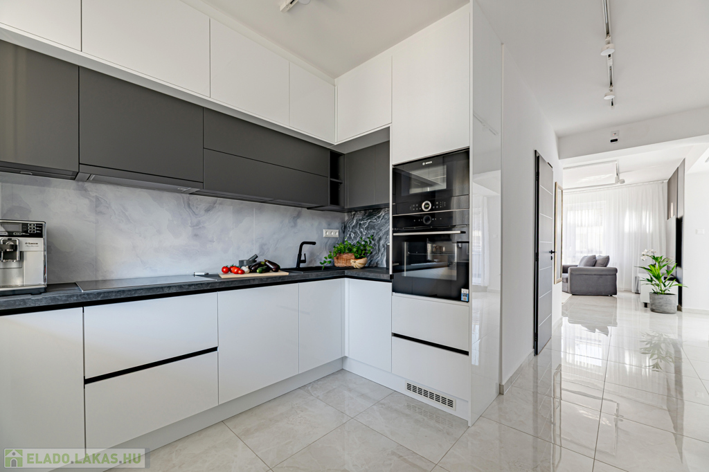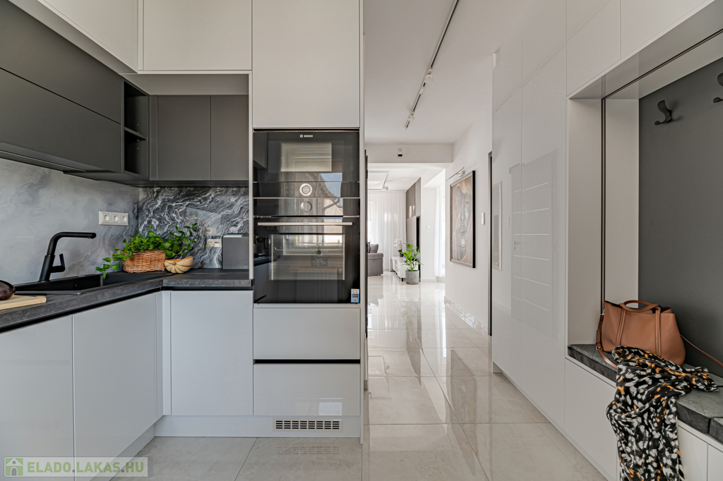 A konyhabútorba és a tálalóba minőségi, Bosch gépek kerültek beépítésre: mosogatógép, szagelszívó, sütő, főzőlap mikró, borhűtő, hűtőszekrény.)