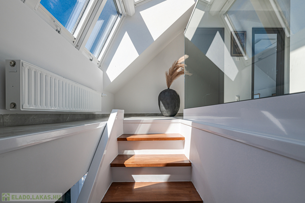 A két szint színvilága kicsit elkülönül egymástól, mégis teljes a harmónia. A szinteket a vadonatúj gipszbeton elemekre helyezett diófa lépcsősor köti össze.