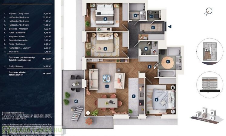 • 97,46 m² alapterület („nettó” 93,56 m2, „bruttó” 97,46 m2 alapterületű)