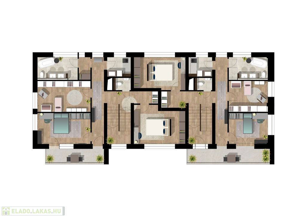 Ezen a szinten 3 önálló, külön nyíló szoba található, gardrób/ vagy inkább szülői fürdőszoba igény szerint, háztartási helyiség, egy fürdőszoba, külön wc, közlekedő.