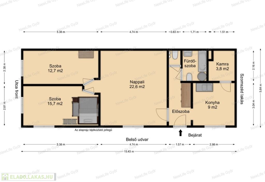 Elosztása: tágas nappali +2 nagy méretű hálószoba, egyikben galéria, fürdőszoba káddal, toalettel, illetve külön mellékhelyiség is kiépült a legutolsó felújítás alkalmával. Tágas konyha kamrával, előszoba beépített gardróbbal.