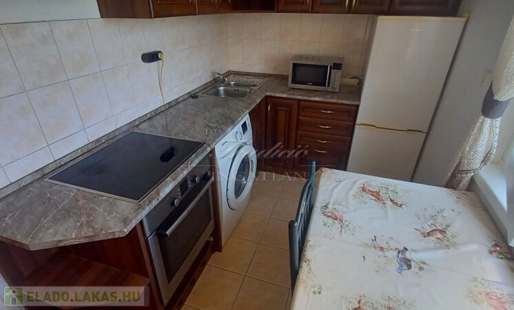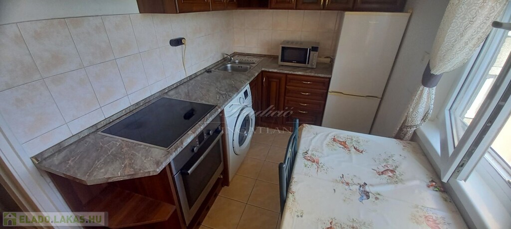 A távfűtéses ingatlan, jó minőségű konyhabútorral van szerelve, amelyben még a mosógép is helyet kapott.