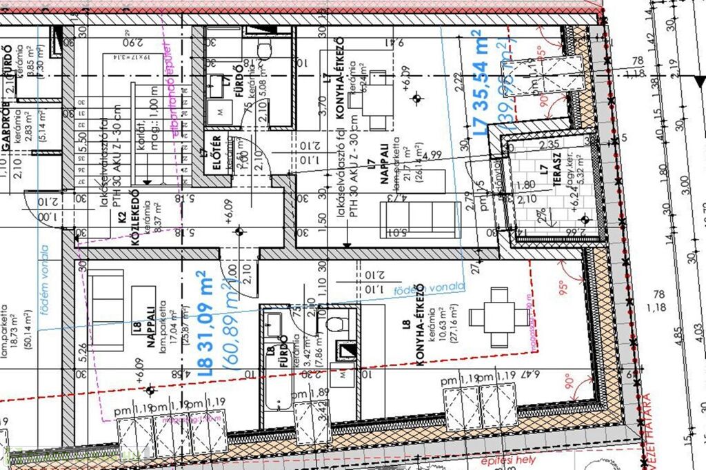 Tetőtéri L7 lakás bruttó 39,98 m2 (nettó 35,54 m2 ) helyiségei: amerikai konyhás nappali, fürdő WC-vel, előszoba, háztartási helyiség WC-vel, közlekedő. ERKÉLY 5,32 m2