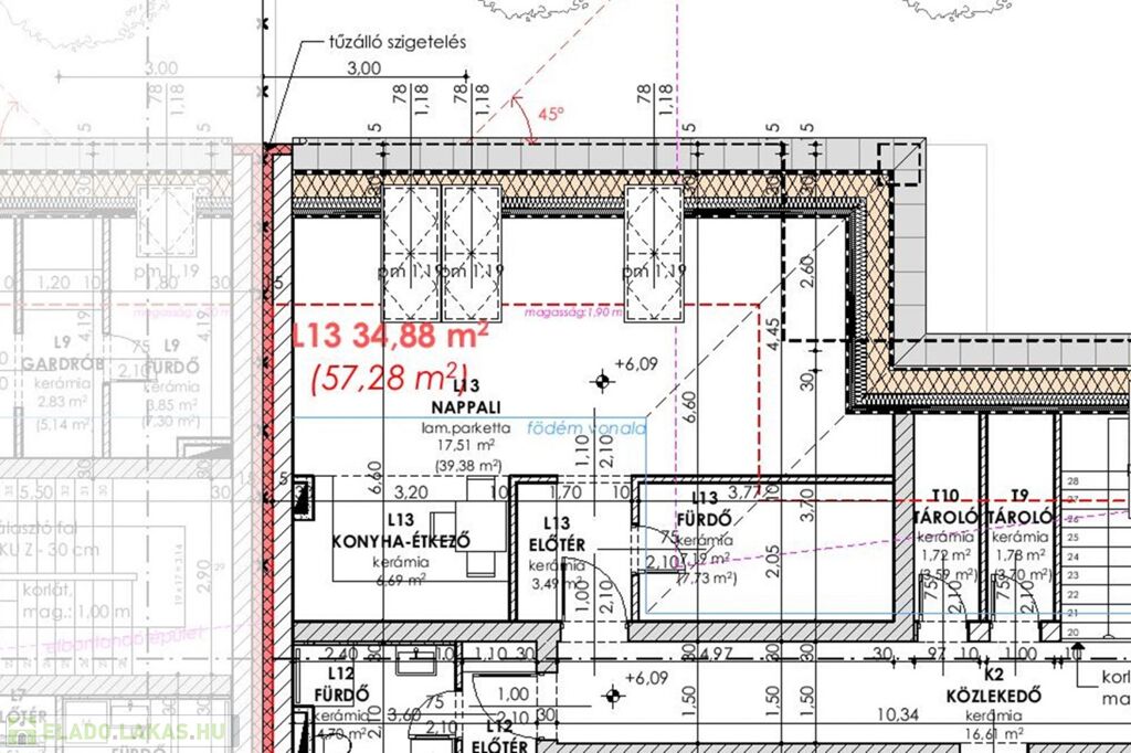 L13 tetőtéri lakás bruttó 57,27 m2, (nettó 34,88 m2).