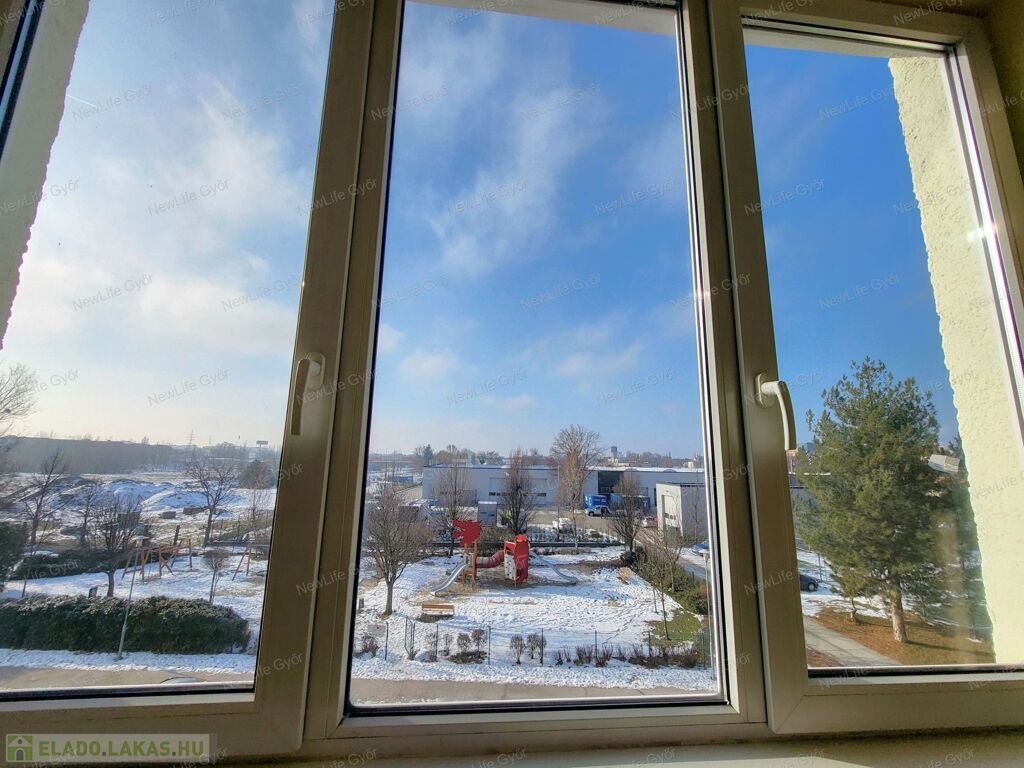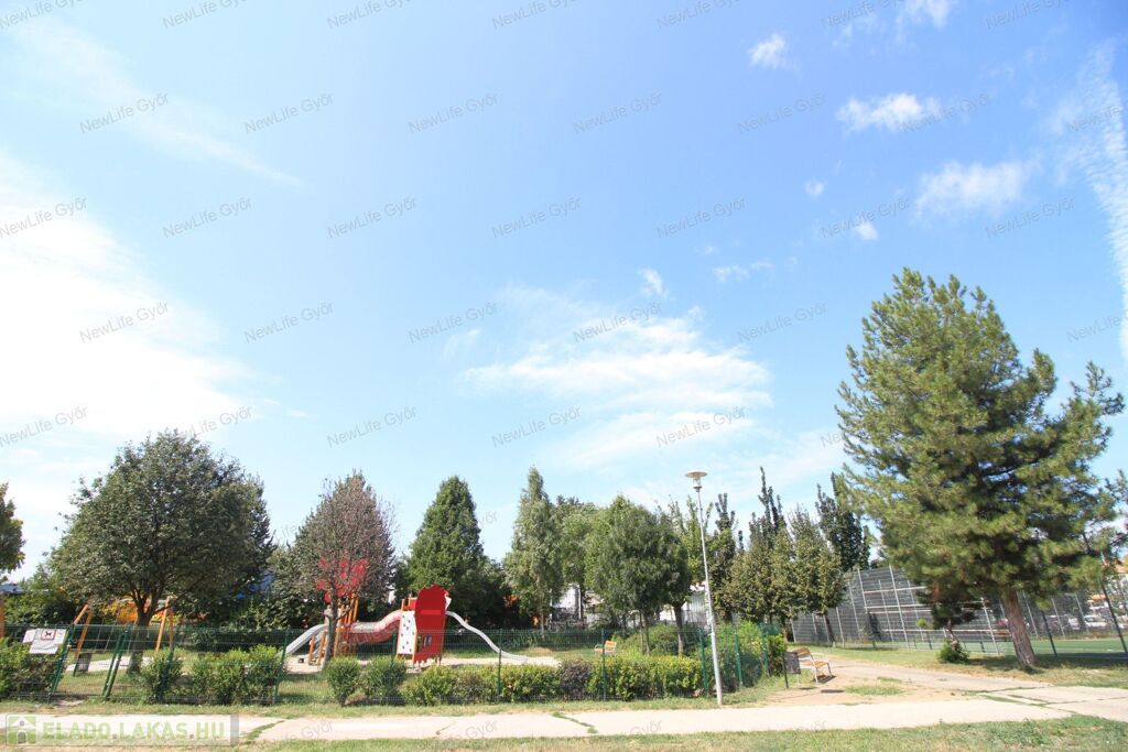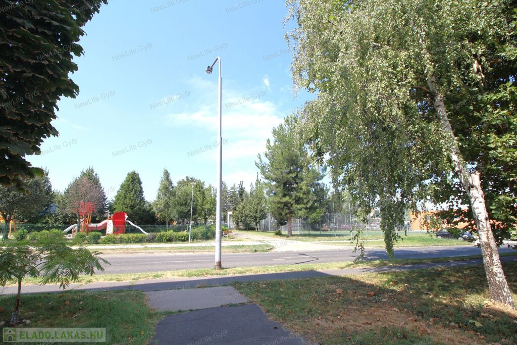 A lakás frekventált, mégis csendes helyen van, alacsony forgalmú utcában, ahonnan gyalogosan is mindent kényelmesen meg lehet közelíteni, autóval 1-2 perc alatt szinte mindent. Közel van az Árkád, ETO Park, Aldi, Lidl, Interspar, OBI, kisebb boltok, benzinkút, dohánybolt stb. Gyerekek számára bölcsőde, óvoda, iskola, gyermekorvos, valamint park és játszótér. A ház környékén a közterületen ingyenes a parkolás és mindig van szabadhely.
