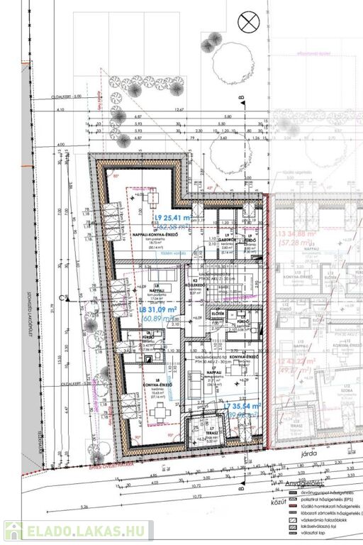 Kerítés 4 oldalról, elektromos kapu lakásonként 1 db távirányítóval, nyitott kukatároló a tervek szerint, helyszínrajz szerinti közlekedők, gépkocsibeállók térkövezve.