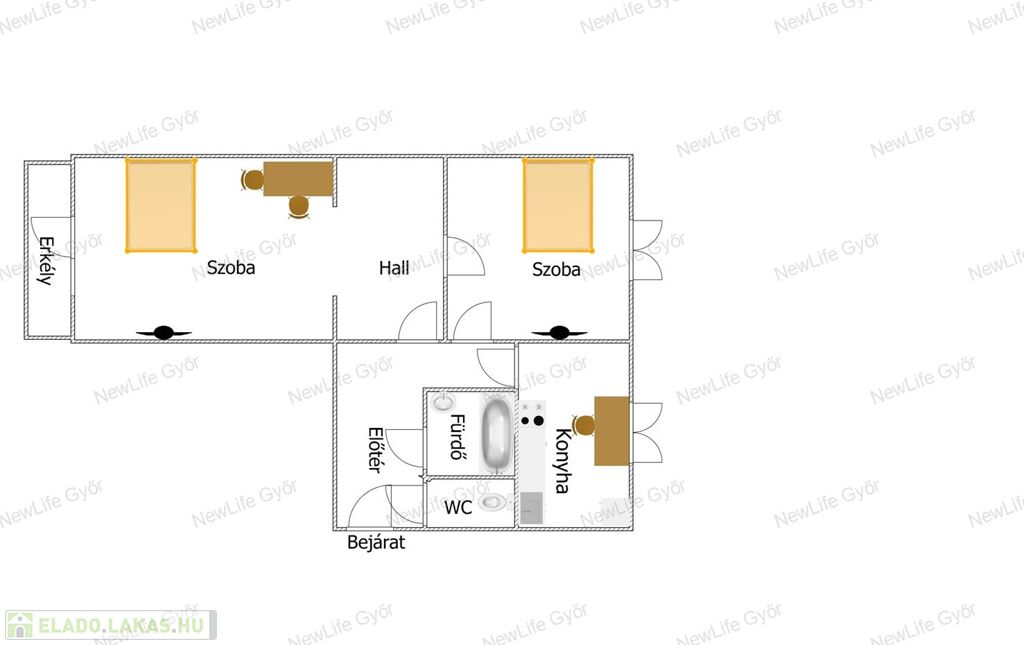 Elosztását tekintve egy előszoba, WC, fürdőszoba, konyha, 2 szoba és hall alkotja.