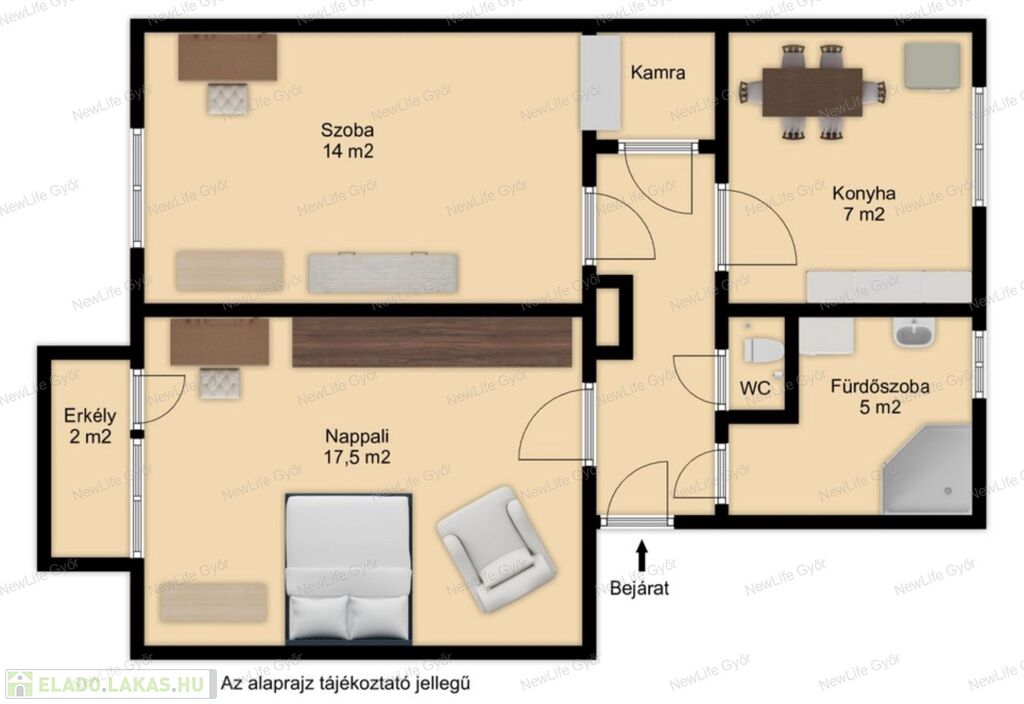 Elosztása: tágas nappali erkéllyel, nagyméretű hálószoba, konyha, kamra, zuhanyzós fürdőszoba külön WC-vel, közlekedő.