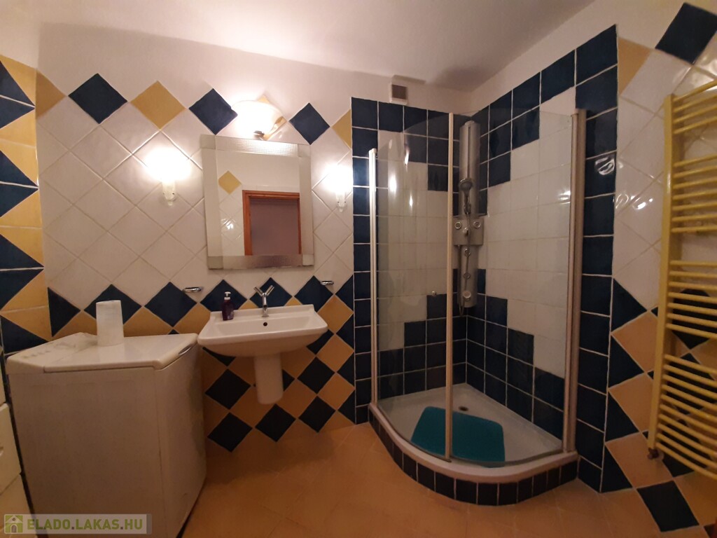A tágas fürdőszoba zuhanykabinos, itt kapott helyet a mosógép is és egy tárolószekrény is.