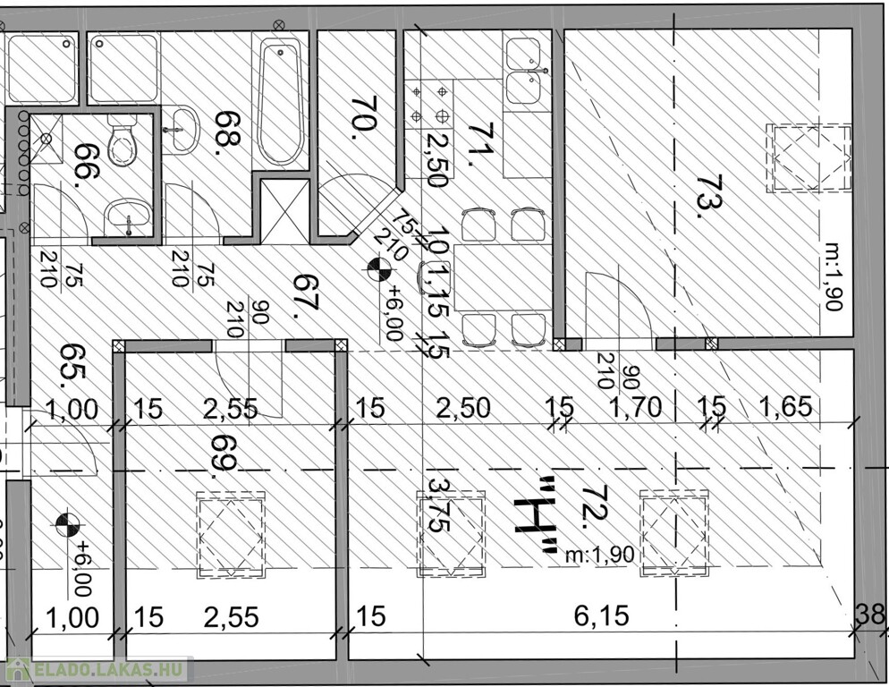 Nappali-étkező konyha, 2 szoba, fürdőszoba, háztartási helyiség.