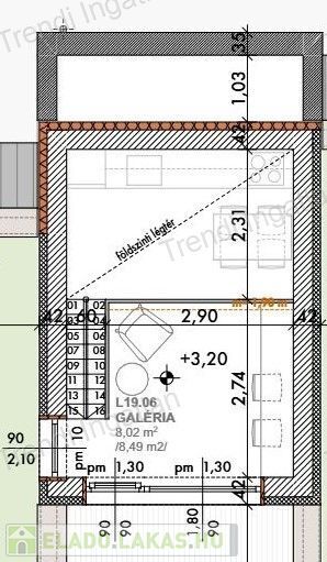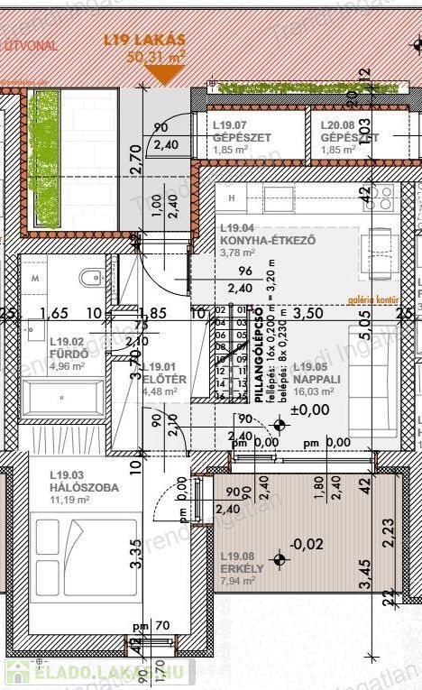 A meghirdetett 1. emeleten található 50,31 nm-es lakásban az alsó szinten amerikai konyhás nappali, szoba, fürdőszoba és előtér található. Nappaliból 7,94 nm-es erkély nyílik. A nappaliból vezető lépcsőn keresztül érhető el a galéria, ami akár hálószobának is alkalmas.