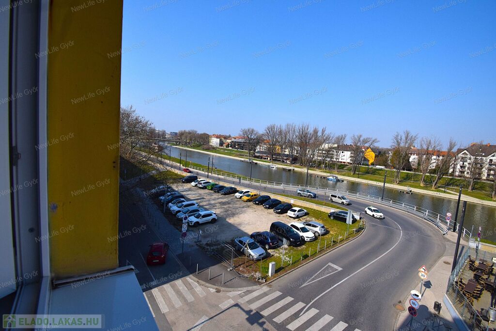 A nappali és konyha ablakból csodás kilátás nyílik a Mosoni-Dunára, ezen túl pedig üzletek, a belvárosi forgatag, Egyetem is szinte az ablakból látszik.