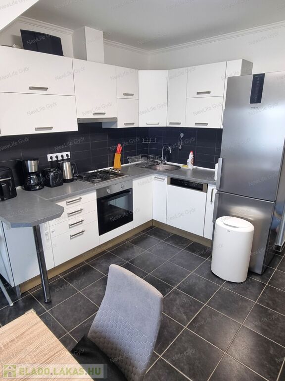A konyha beépített gépekkel (villanysütő, gáztűzhely, mosogatógép, páraelszívó) felszerelt.