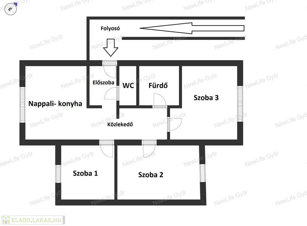 amerikai konyhás nappali + 3 különálló szoba, előszoba, külön WC, külön fürdőszoba, közlekedő