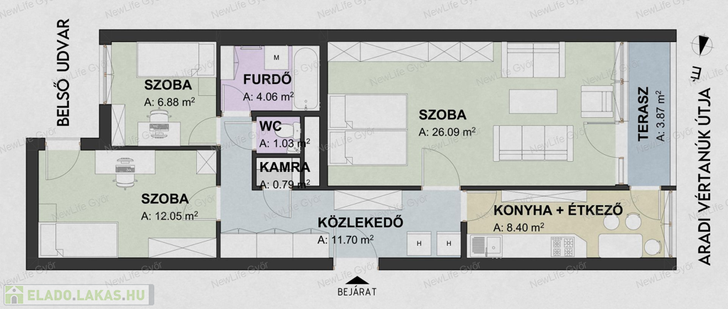 A lakást tágas terek jellemzik, így biztosított a kényelmes élettér. Elosztás szempontjából közlekedőből, konyha+étkezőből, kamrából, nappaliból, hálószobából, félszobából, fürdőből és egy külön helyiségben elhelyezett WC-ből áll. A konyhából és a nappaliból egyaránt kijuthatunk az erkélyre, amelyről csodálatos panoráma nyílik a városra.