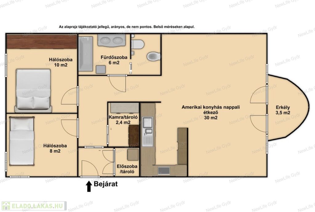Elosztása: tágas amerikai konyhás nappali erkéllyel, 2 hálószoba, kamra, kádas fürdőszoba WC-vel, közlekedő.