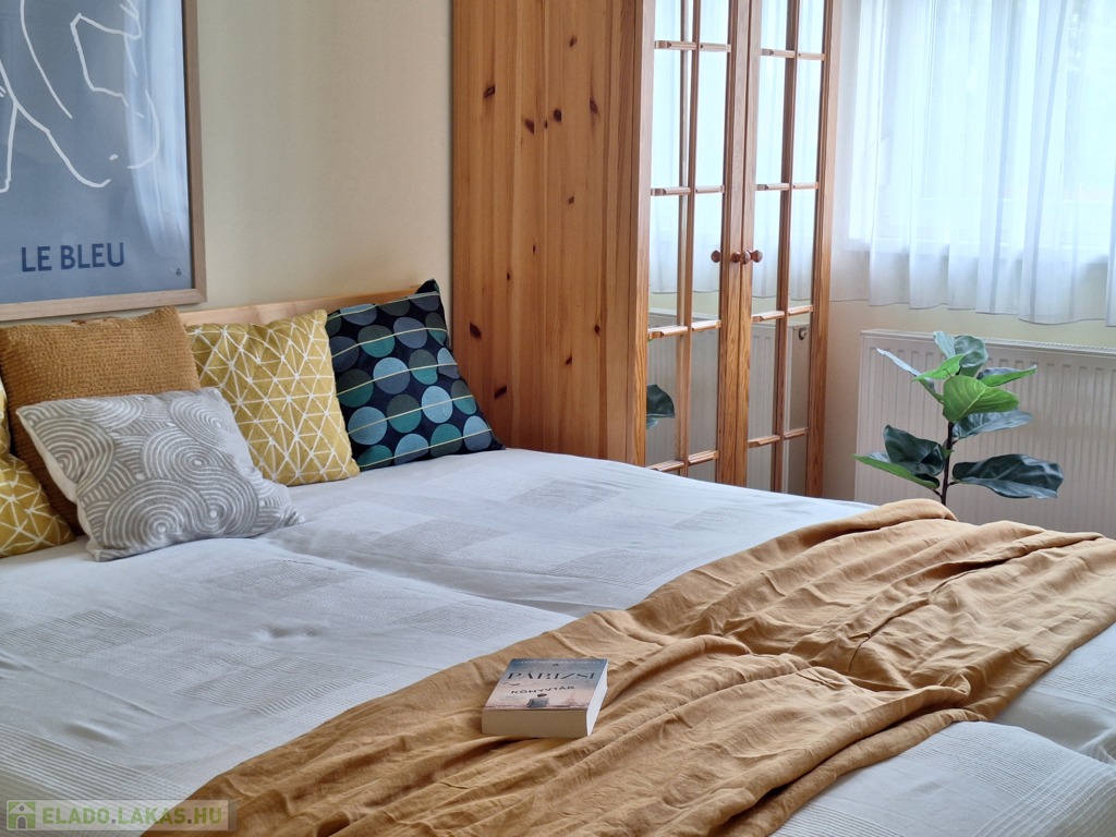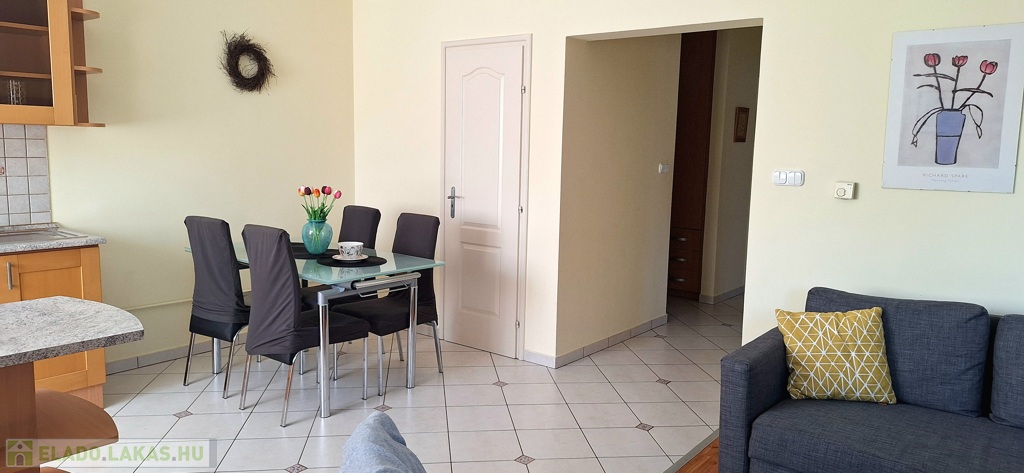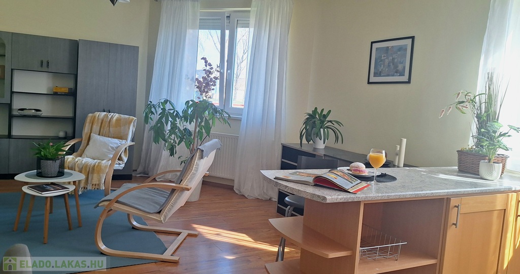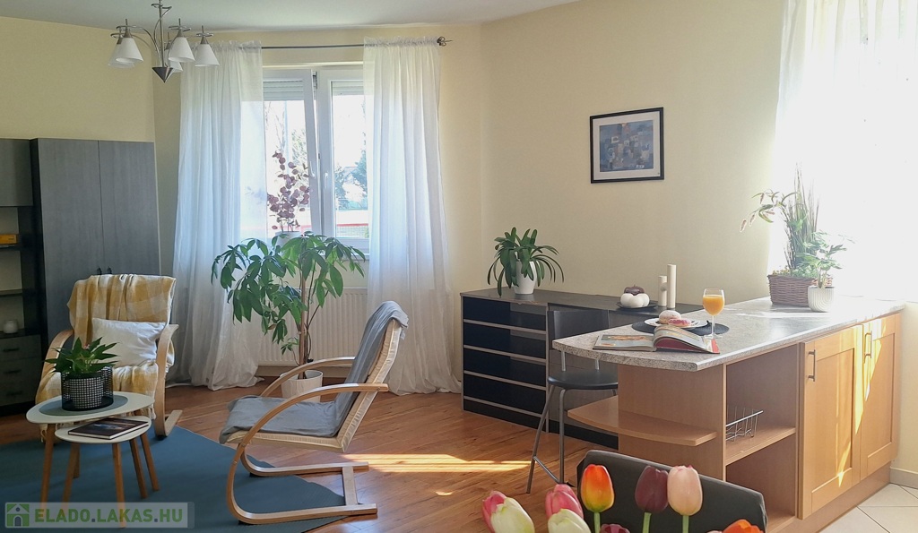 A lakás dél-keleti fekvésű, nagy ablakai a szépen parkosított udvarra néznek. A hálószobákat a reggeli napsütés éri, majd ráfordul az étkező-konyha-nappali együttesére. A lakást a meleg barátságos színek jellemzik. A fa konyhabútor beépített, szagelszívóval, mosogatógéppel, villanysütővel, gáz főzőlappal szerelt. A konyhát és a nappalit konyhasziget választja el egymástól. Bőven jut hely családi ebédeknek is, a 6 személyes asztal mellett. A hűtőszekrény jelenleg a kamrában kapott helyet.