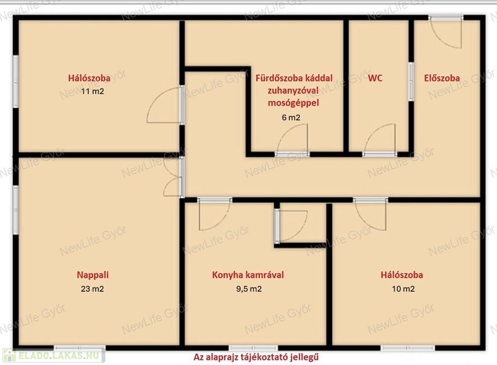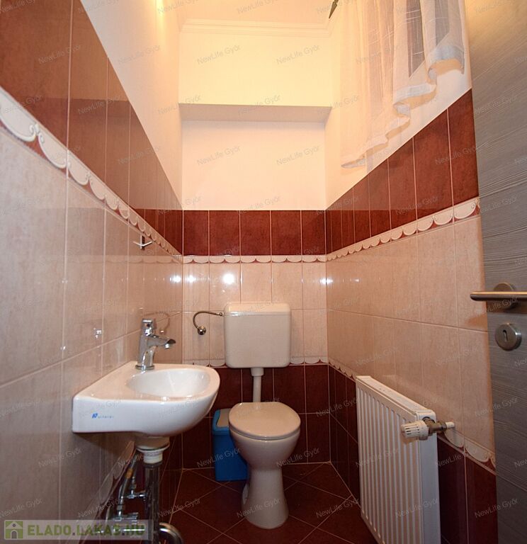 Elosztása: előszoba, konyha étkezővel, kamrával, nappali, két tágas hálószoba, fürdőszoba zuhanyzóval, káddal és külön WC-vel.