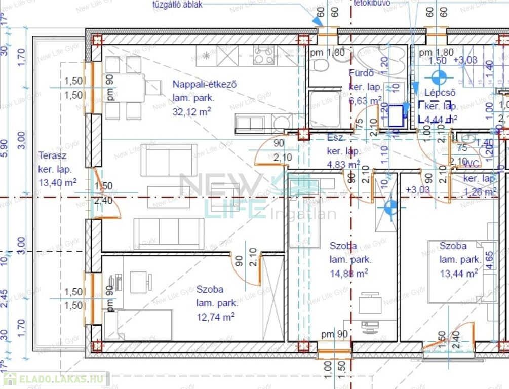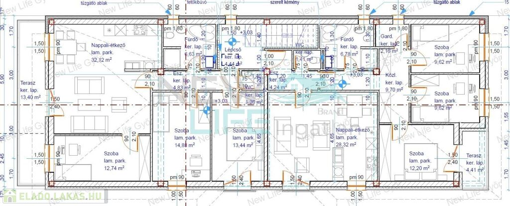 Elosztása: amerikai konyhás nappali étkezővel, három hálószoba, fürdőszoba káddal, WC-vel és egy külön WC, nagy (13,4 m2) terasz.