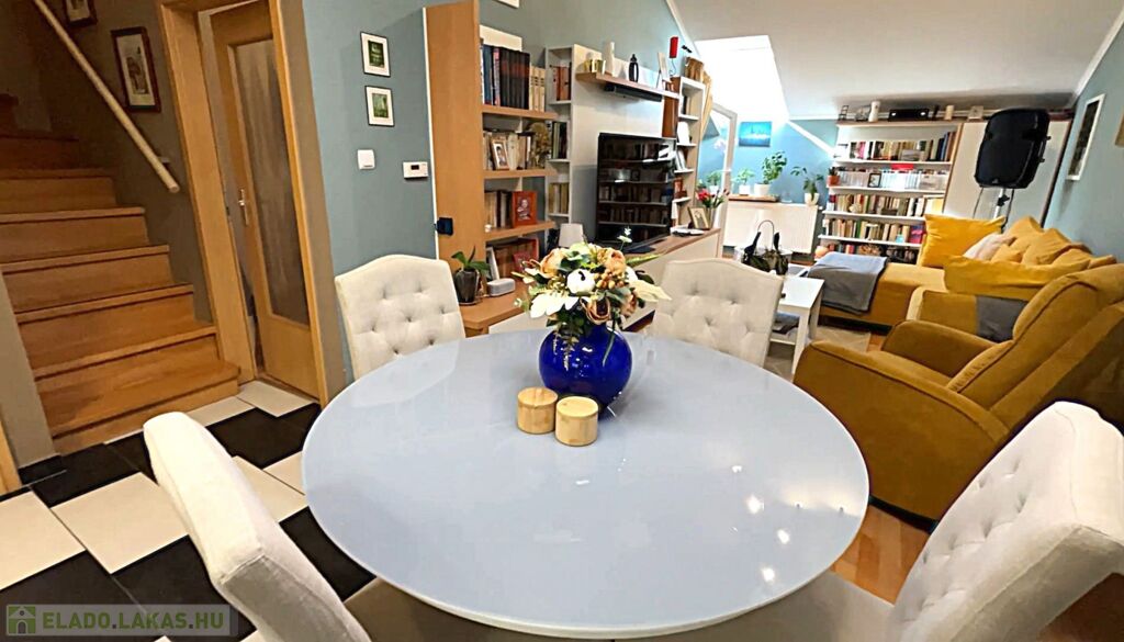 • Tökéletes elosztás: földszinten étkező-konyha-nappali, szoba, fürdő káddal, wc és egy terasz, ami a nappaliból és a szobából is elérhető