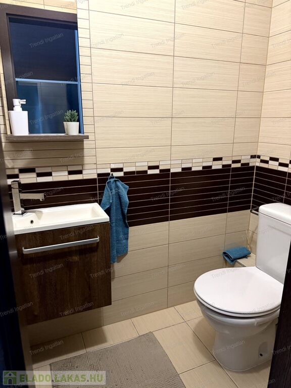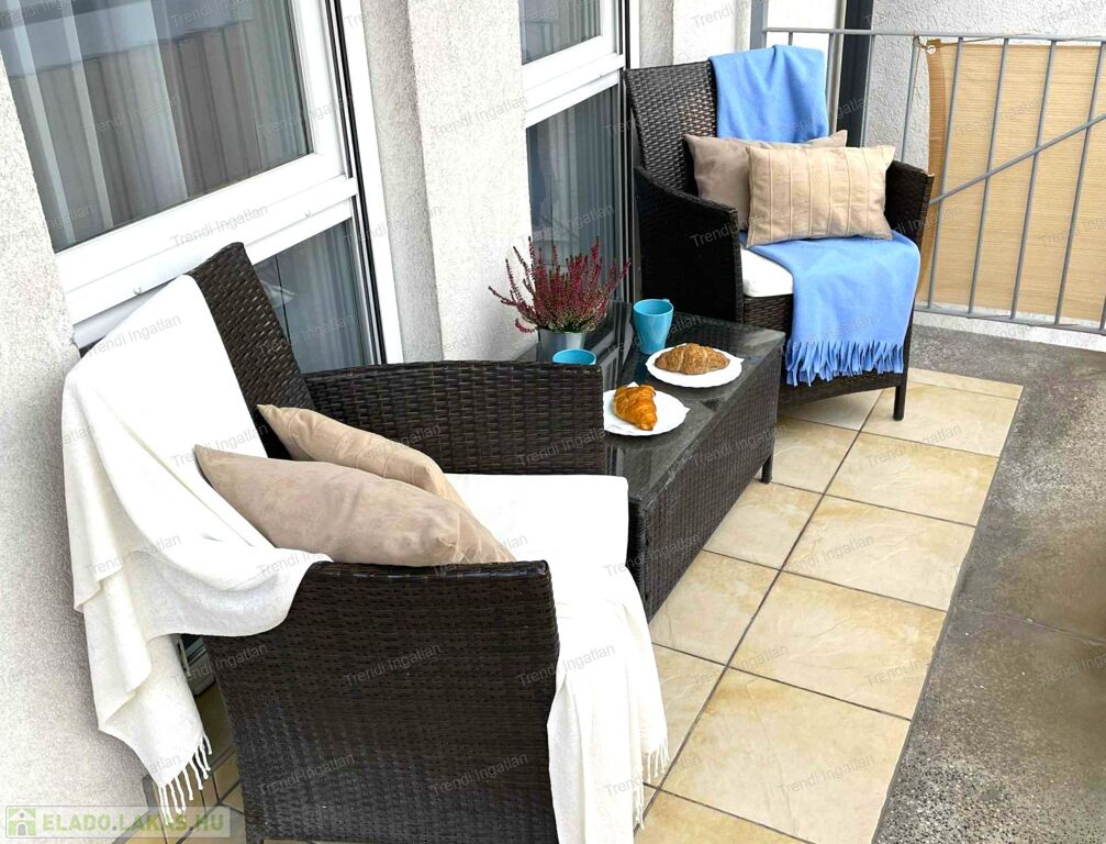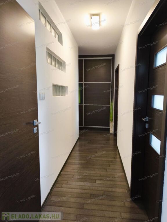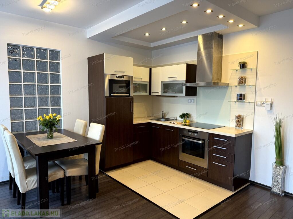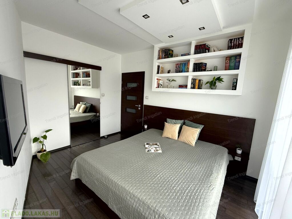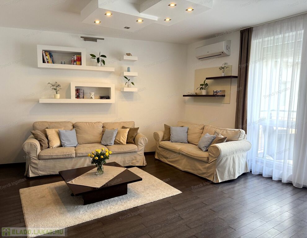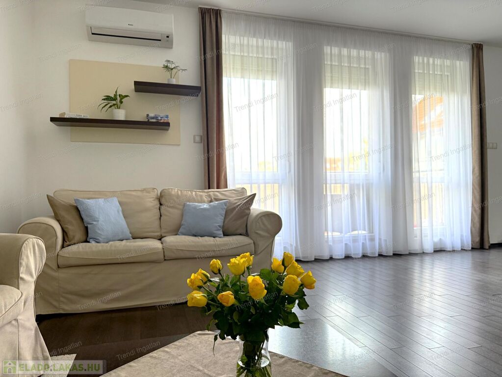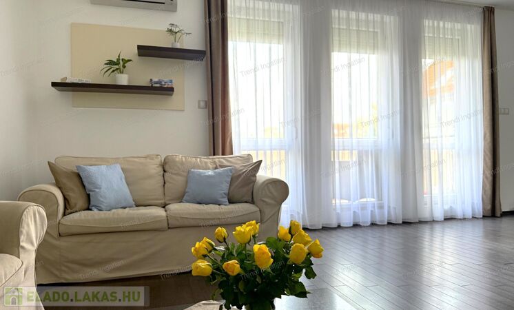 A kényelmes otthonba lépve egy tágas előtérbe érünk, ahonnan az amerikai konyhás nappali tárul elénk. A nappaliból a zárt, parkosított, hatalmas zöld udvarra néző fedett 4,67 m²-es erkély nyílik, amely tökéletes helyszín egy reggeli kávézásra vagy esti kikapcsolódásra. Nappalit az egyedi gipszkarton polcok teszik hangulatossá. A konyha beépített gépekkel (sütő, főzőlap, mikrohullámú sütő, elszívó, hűtő) felszerelt. A nappali és a konyha spot világítással rendelkezik. A közlekedőből elérhető 2 szoba és a hálószoba, melyből egy praktikus kialakítású gardrób nyílik. Az asztalos által készített gardróbszekrény megfelelő helyet biztosít a ruháknak és a cipőknek. Az egyik szoba és a hálószoba egyedi gipszkarton polcos rendszerrel rendelkezik, továbbá a hálószobában spot lámpák biztosítják a világítást. A fürdőszobában kád, dupla mosdó, WC található. A közlekedőből nyílik egy vendég WC. A folyosón az előtér mellett helyet kapott egy egyedi, asztalos által készített hatalmas beépített szekrény, melyben külön szekrényrészek vannak kialakítva a praktikus és könnyebb tárolás érdekében.