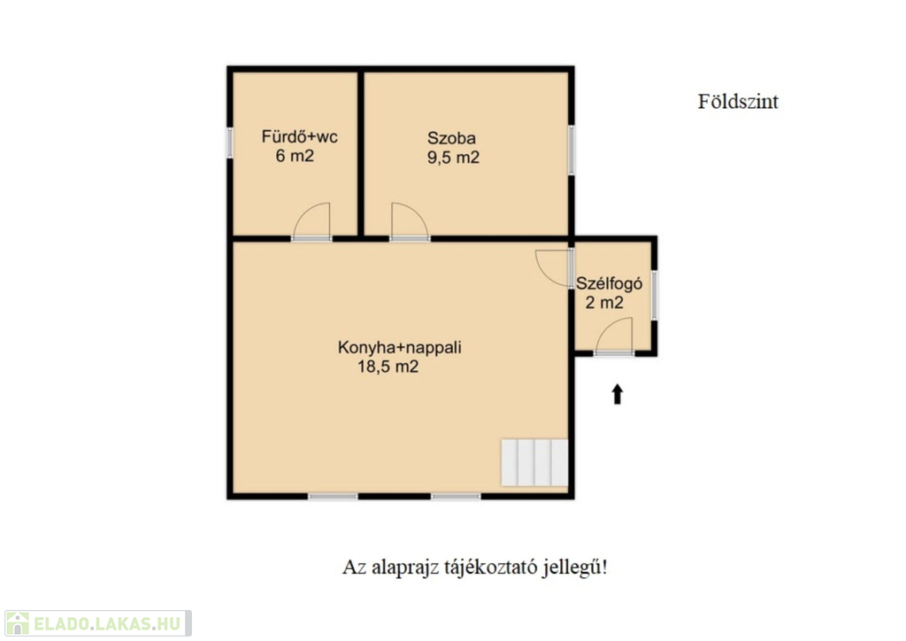 Az ingatlan két szintes, a földszinten a nappali és a konyha egy légtérben kapott helyet, emellett itt található a hálószoba és egy tágas fürdőszoba is. Az emeleti részen egy tároló és egy egy légterű szoba található.