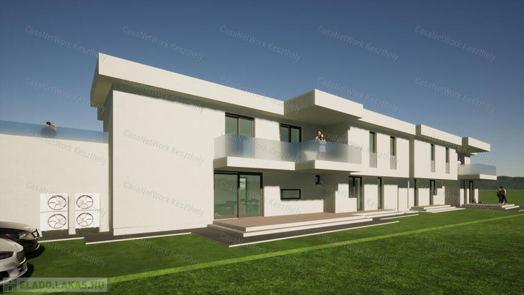 alapterületű, kertkapcsolatos földszinti lakás, amely egy most épülő, lapostetős, hőszivattyúval ellátott, négylakásos társasházban található. Várható