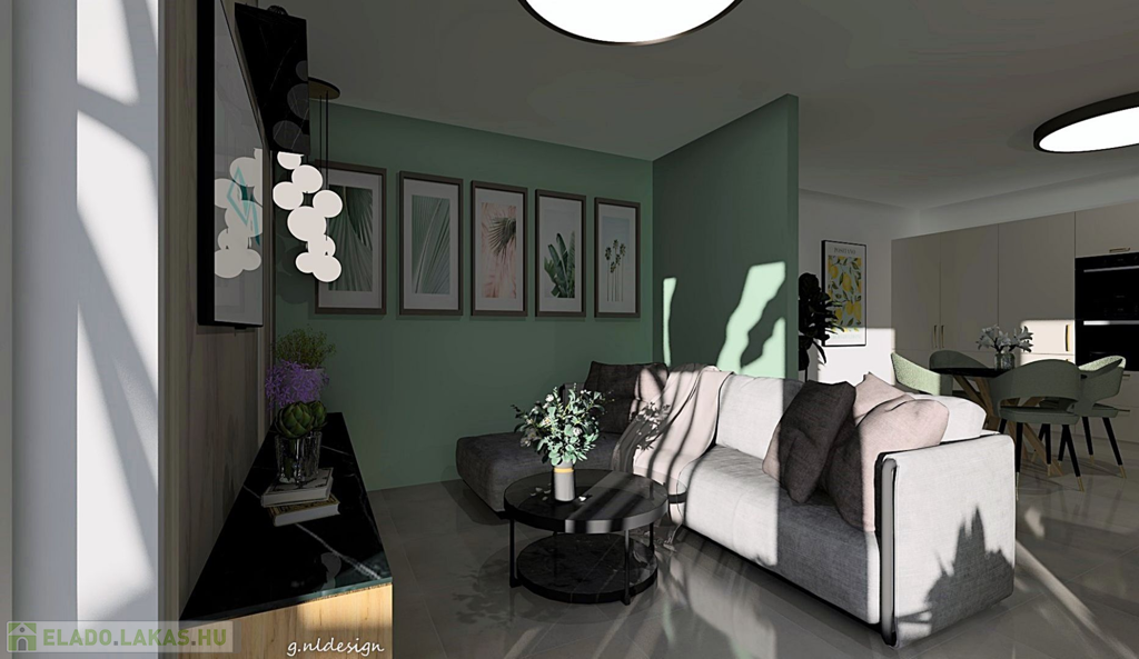 A lakás alapterülete összesen 55,93 m2, amelyhez egy 9,33 m2-es terasz tartozik. A lakáshoz tartozik még egy térkövezett, zárt udvari kocsibeálló is. A lakás helyiségei: hatalmas étkező-konyha, nappali, 1 hálószoba, fürdő, WC kézmosóval, előszoba.
