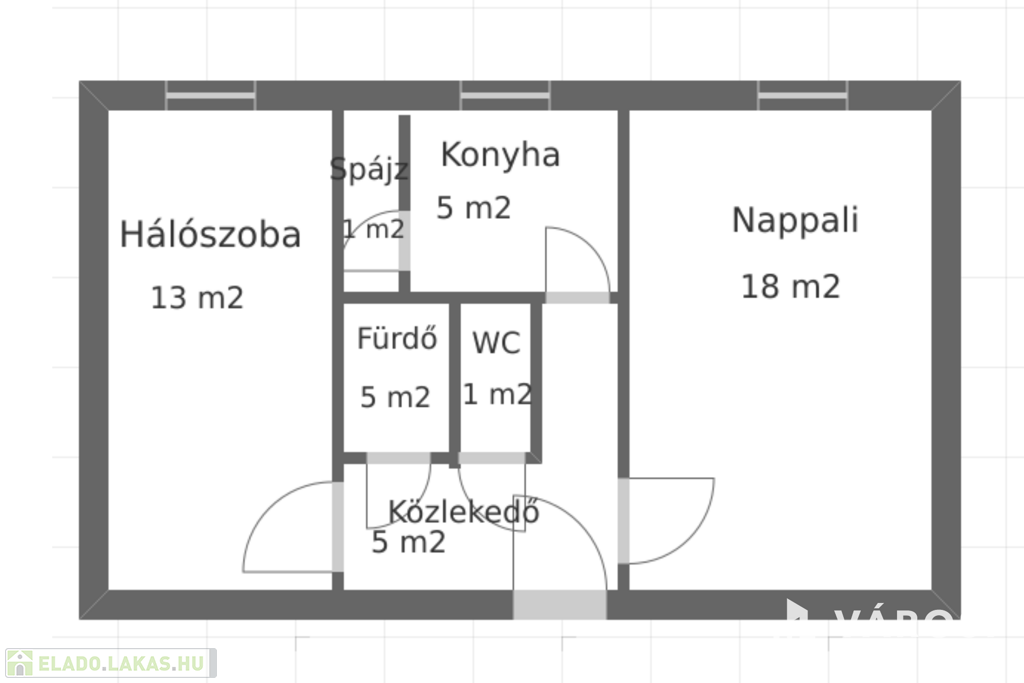 A lakás 1 nappaliból (18 m2), egy hálószobából (13 m2), közlekedőből (5 m2), konyhából (5 m2), spájzból (1 m2), WC-ből (1 m2) és fürdőszobából (5 m2) áll. Egyedi hőfokszabályzós radiátorokkal történik a fűtése távfűtéssel, igen kedvező számlákat produkálva.