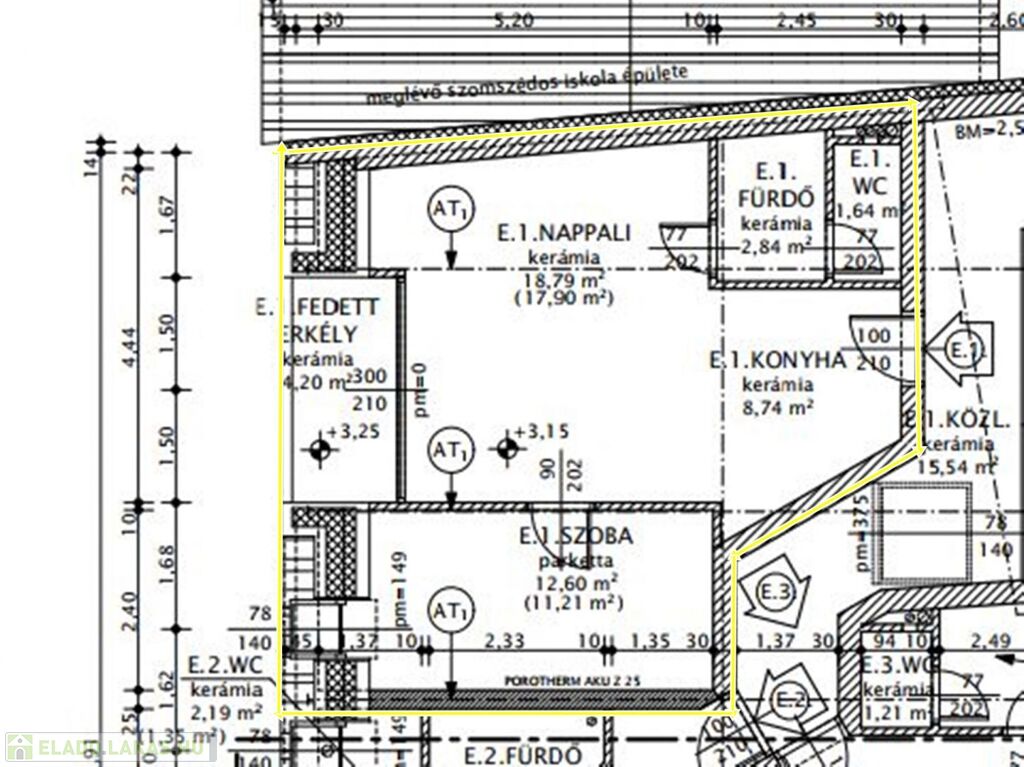 nappali 17,9 m2/bruttó 18,79 m2, konyha 8,74 m2, szoba 11,21 / bruttó 12,6 m2, fürdő 2,84 m2, WC 1,64m2 + FEDETT ERKÉLY 4,2 m2.