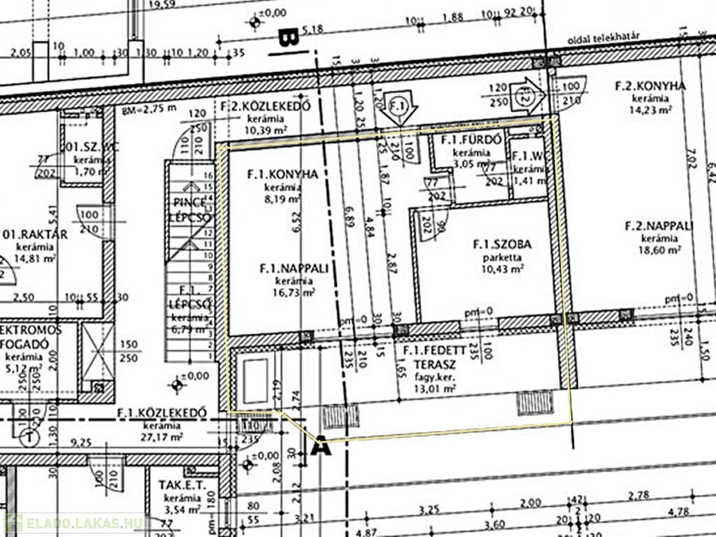 nappali 16,73 m2, konyha 8,19 m2, szoba 10,43 m2, fürdő 3,05 m2, WC 1,41 m2,
