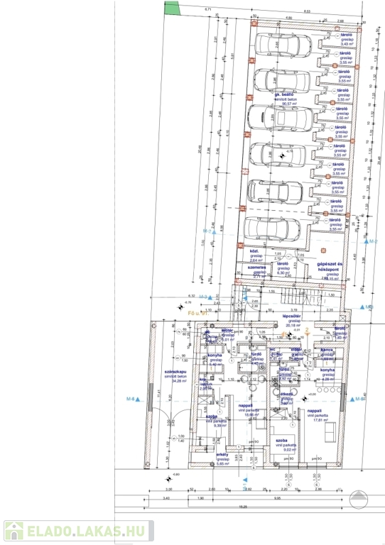 A társasház zárt, elektromos kapubeállóval ellátott udvarán kialakított felszíni beállóhely 2.500.000. Ft-ért, míg "garázs" és hozzá tartozó dupla méretű tároló helyiség 8.000.000.-Ft-ért vásárolható a lakásokhoz.