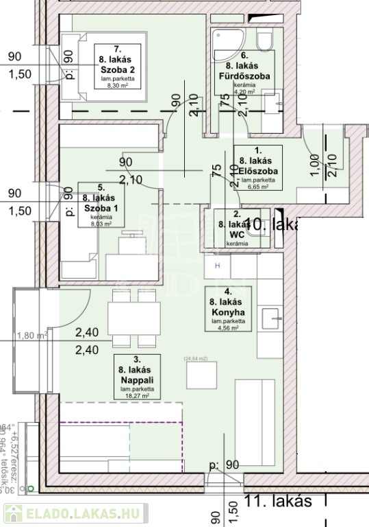 A B8 megjelölésű második emeleti lakás 51,4 m2 alapterületű. Az amerikai konyhás nappalin túl 2 szoba, fürdőszoba, mellékhelyiség, és előszoba kapott teret a lakásban. A közösségi térből közelíthető meg a 2 m2-es erkély.