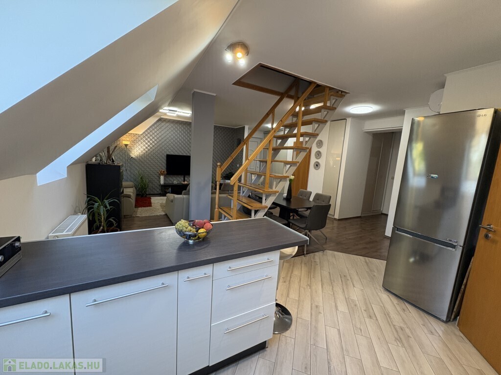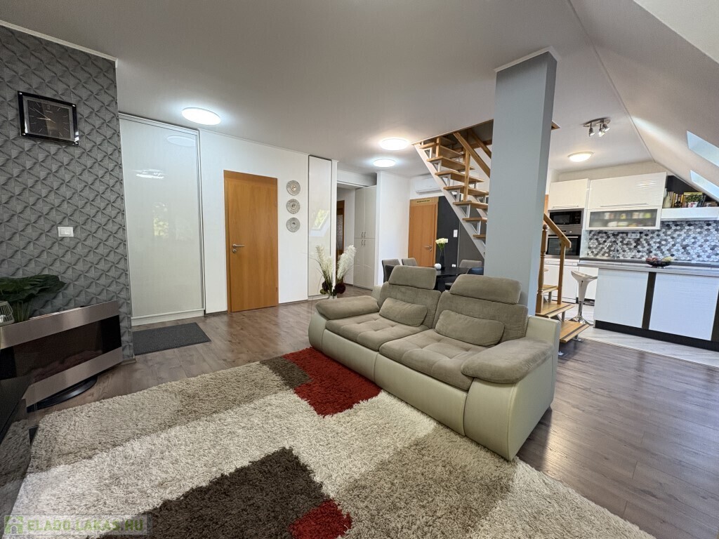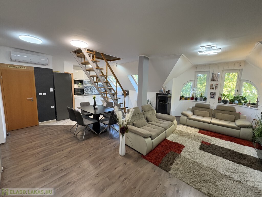 Kaposváron a belvárosban, a Fő utcában - közvetlenül a kórház közelében - található 1999-ben épült, kifejezetten rendezett társasház 3. emeletén lévő 121 m2-es, ideális elosztású, nagyon jó állapotú két szintes lakás eladó. A lakás alsó szintjén előszoba-nappali-étkező-konyha, kamra, 2 szoba - közös erkéllyel, fürdőszoba, wc-kézmosó helyiségek találhatóak. A felső szinten előszoba-közlekedő, 2 szoba, fürdőszoba, wc kerültek kialakításra. A lakás rezsi költsége nagyon kedvező, a fűtést és a melegvízet új Immergas kombi gázkazán szolgáltatja, a nappaliban és a tetőtéri 2 szobában 1-1 új Gree légkondícionálót szereltetett fel a tulajdonos. A társasháznak nagyon szép, rendezett udvara van, ahová 1 személyautóval ingyenesen tud parkolni a lakás tulajdonosa.