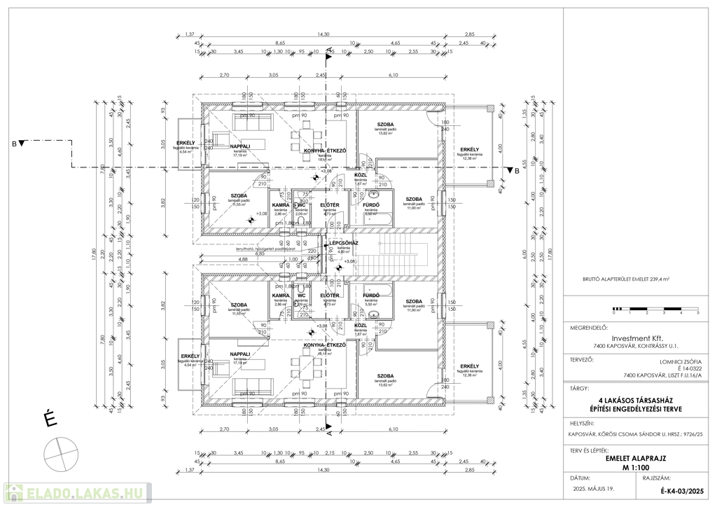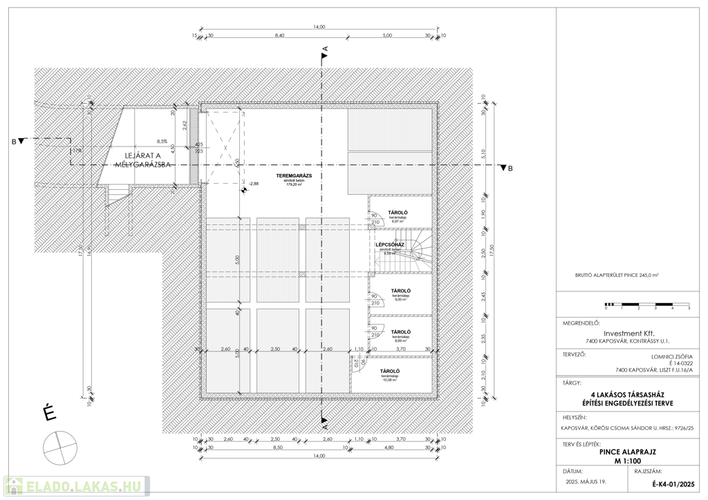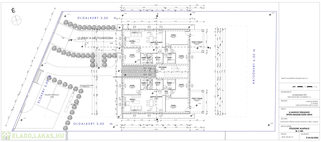 Kaposváron a Kecelhegyi városrészben, a Kőrösi Csoma Sándor utcában, új építésű, exkluzív - magas minőségben kivitelezett, korszerű építőanyagokból épülő, energiatakarékos társasházban - 4 db lakás eladó. A társasház földszintjén 2 db 97,91 m2-es lakás, míg az 1. emeleten 2 db 96,13 m2-es lakás kerül kialakításra. Minden lakásban előszoba, nappali - terasz vagy erkély - konyha, 3 szoba, fürdőszoba-wc helyiség lesz kialakítva, továbbá minden lakáshoz megvásárolható önálló tároló és egy felszíni parkoló, illetve a mélygarázsban 2 db beálló, elektromos autótöltővel. A kerítés kialakítása oly módon történik, hogy a felszíni parkolót kapunyitás nélkül is meg lehessen közelíteni. A korszerű, modern energetikájú - ezáltal alacsony rezsivel rendelkező - épület fűtése és hűtése levegő-víz hőszivattyúval lesz biztosítva, igény szerint napelemes támogatással, továbbá fan-coil rendszer szolgáltatja az igényelt hőmérsékletet a lakásban. A hőszigetelt faszerkezetű nyílászárókhoz igény szerint zsaluziák lesznek felszerelve, illetve prémium minőségű szaniterek és szerelvények, illetve csapok kerülnek beépítésre. A megállapodás szerint a konyhabútort (bútorlapból) igény esetén az eladó fogja legyártatni, amelyre a felek külön megállapodást kötnek. A lakáshoz tartozó önálló udvar mérete lakásonként 200 m2. A lakások az ideális lokáció miatt jó választás lehet családoknak és befektetőknek egyaránt - élelmiszerbolt, iskola, óvoda és buszmegálló gyalogos távolságban percek alatt elérhető. Az épület teljes kivitelezése és a műszaki átadása várhatóan 2026. IV. negyedévben történik meg.Energetikai besorolás: A