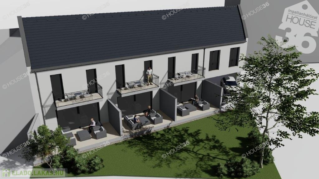 A társasházban 3 db lakáson belül 2 szintes saját kertkapcsolatos sorházi lakás kerül kialakításra, illetve 1 db exclusive, 1 szintes lakás, külön bejárattal, amerikai konyhával, nappalival, 3 hálóval, 2 fürdővel, nagy terasszal.