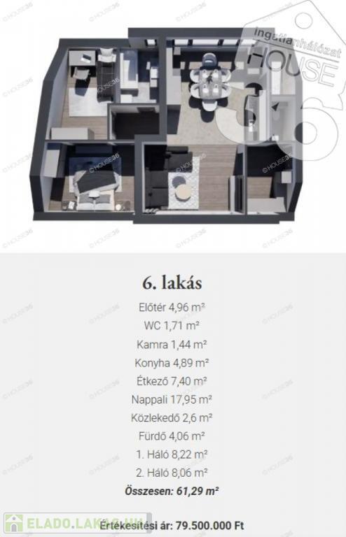 6-os lakás, 1. emeleti, nappali + 2 szobás, 61,29 m2