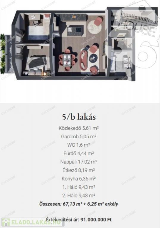 5/b lakás, 67,13 m2, nappali + 2 szoba, gardrób, 6,25 m2 erkély