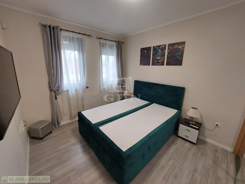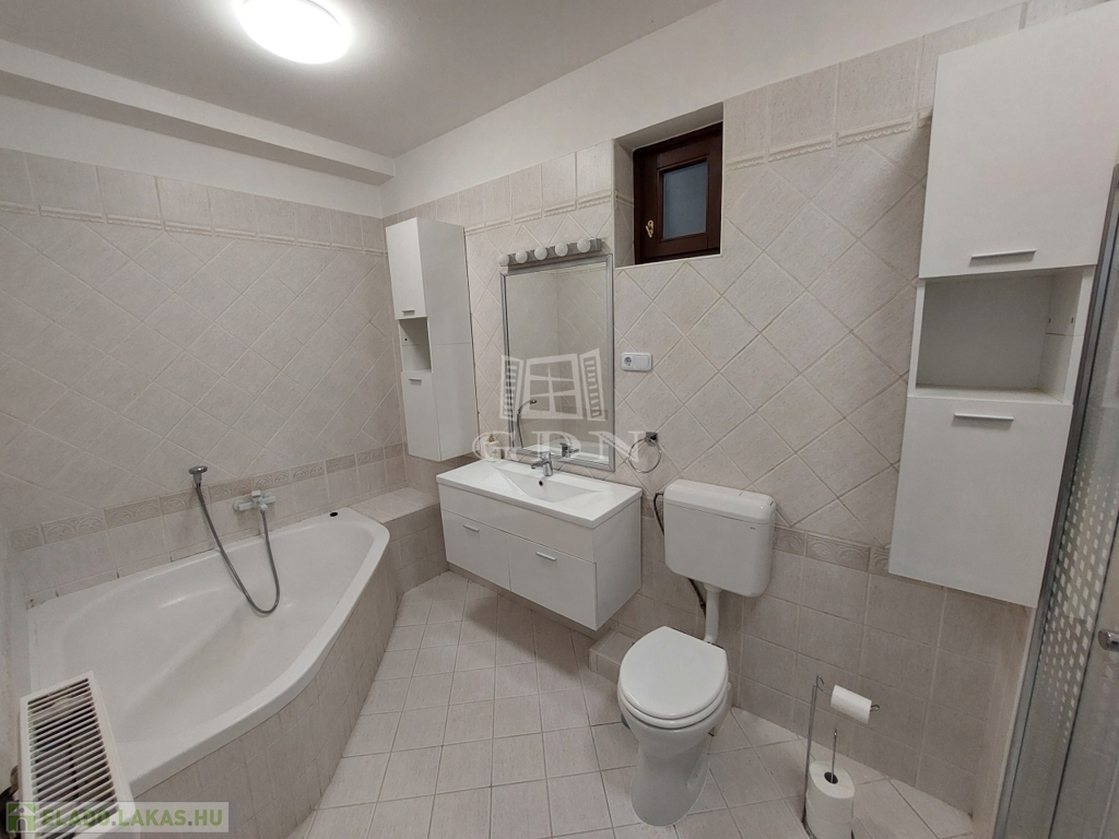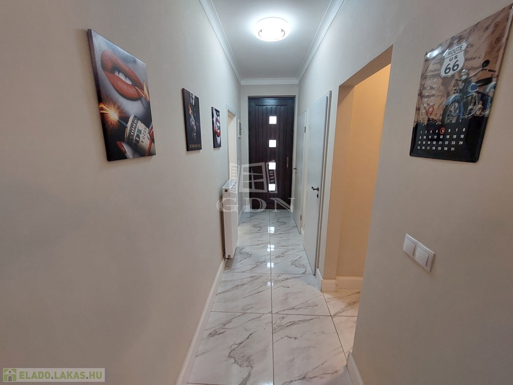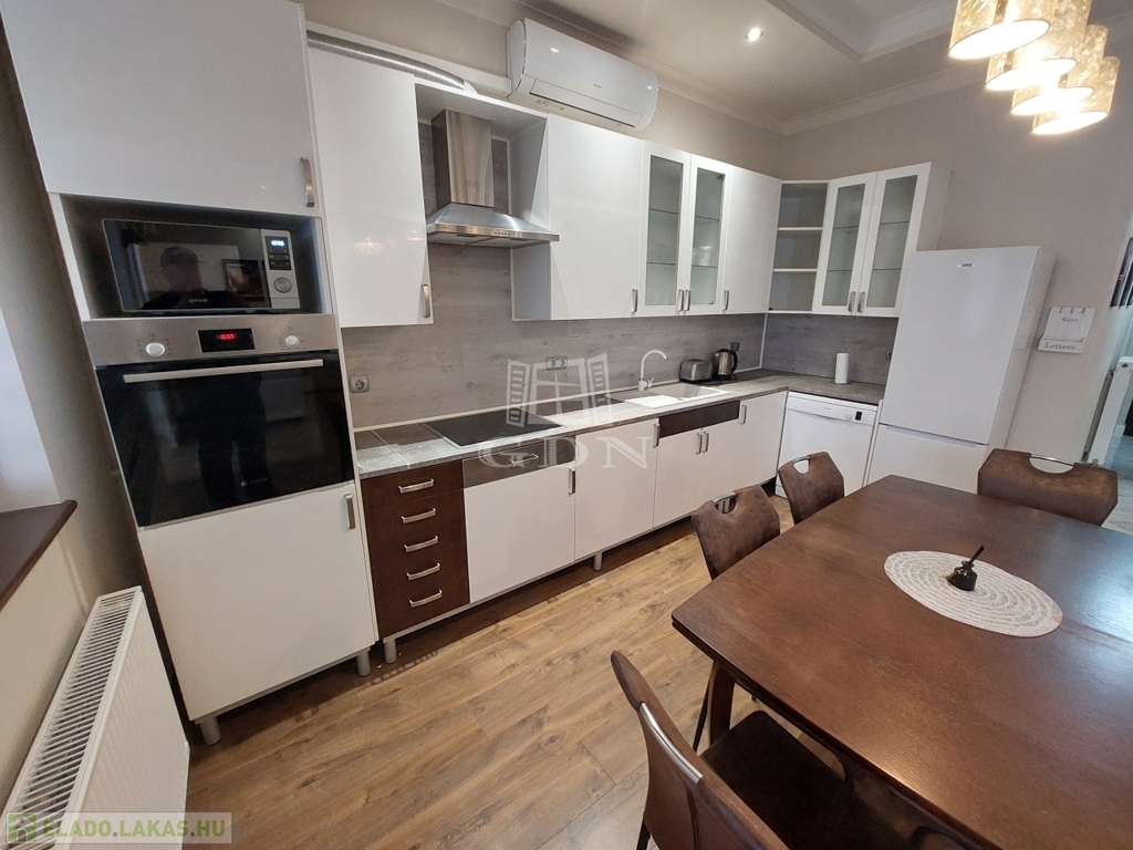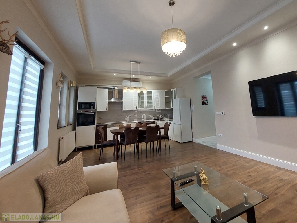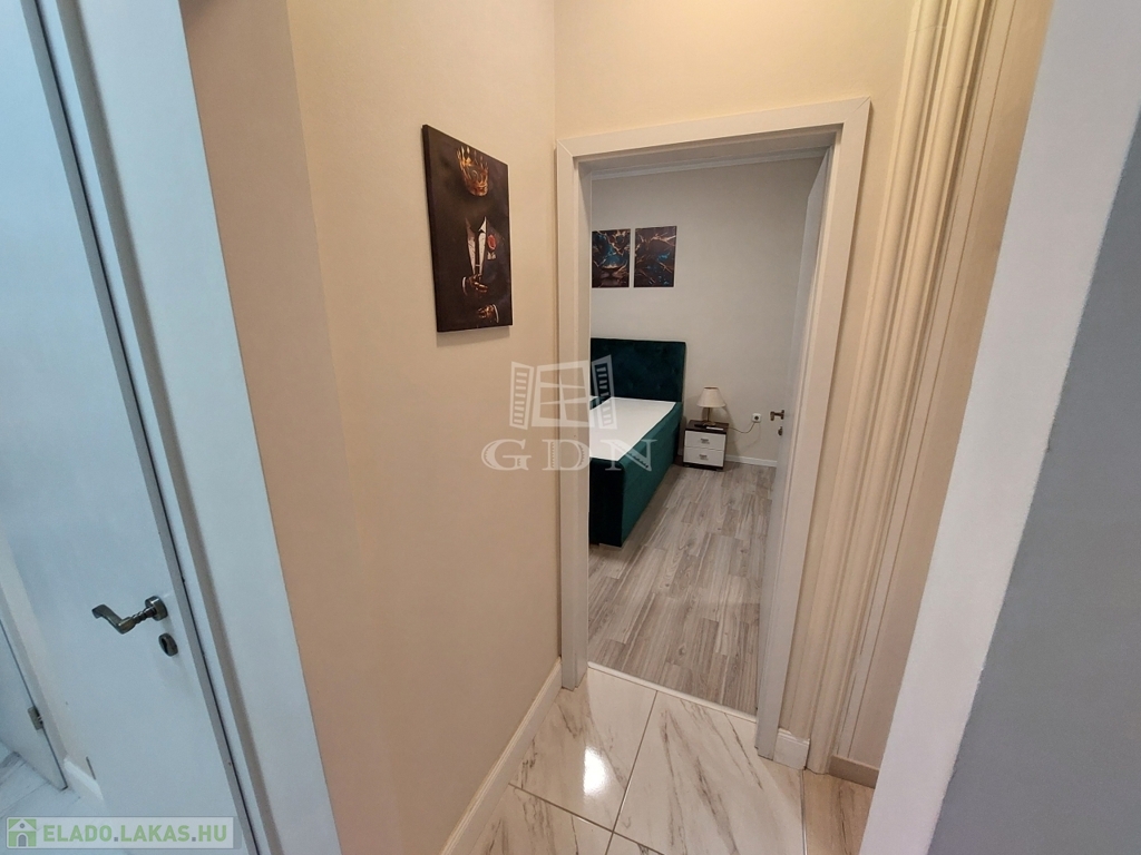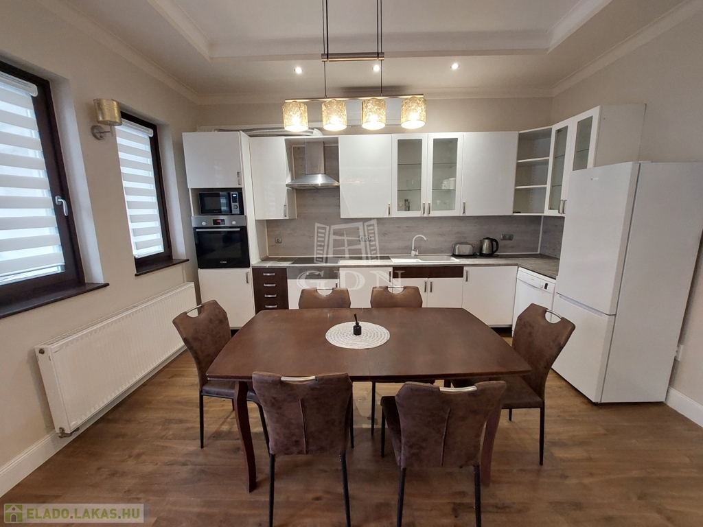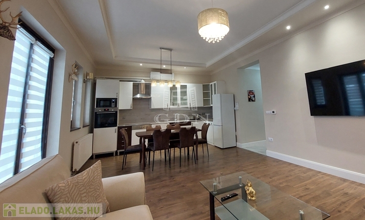 A belső elrendezés minden részlete tudatos tervezés eredménye. Az előtérből külön vendég WC nyílik, valamint egy exkluzív fürdőszoba, ahol wc, kád és zuhany is rendelkezésre áll. A hálószobában egyedi, tükörajtós beépített gardrób teszi izgalmassá a teret és biztosítja a maximális kényelmet. Innen tárul fel a lakás reprezentatív központja: a nagyvonalú, amerikai konyhás nappali–étkező, amely tökéletes teret ad elegáns vendéglátáshoz és meghitt mindennapokhoz egyaránt.