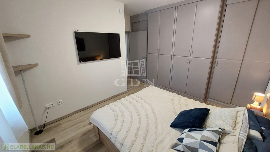 Az ingatlan belső elrendezése tudatos tervezés eredménye. Az előtérből külön WC, egy kis gardrób nyílik, valamint egy igényesen kialakított fürdőszoba. A hálószobában egyedi, beépített gardrób gondoskodik a praktikus és esztétikus tárolásról. A lakás központi tere a tágas, nagy belmagasságú amerikai konyhás nappali–étkező, amely világos, jól bútorozható.