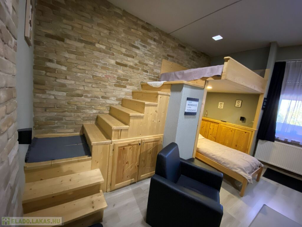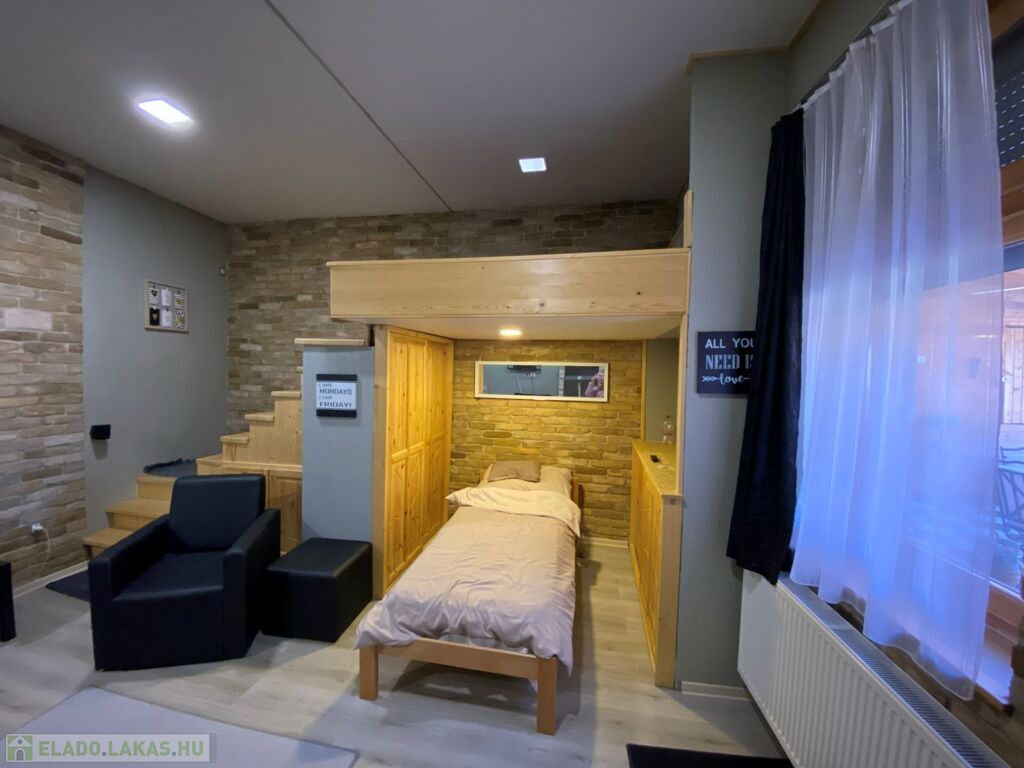 Az ingatlanban található egy fürdőszoba zuhanyzóval, wc-vel; étkező-konyha egybenyitva; egy szoba, melyben galériás megoldással került kialakításra a hálórész.