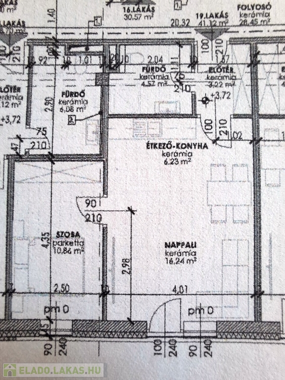 A lakás 41,12 nm, helyiségei:előtér 3,22 nm, fürdőszoba 4,52 nm, gardrób/szoba 10,84 nm, étkező/konyha 6,23 nm, nappali/lakószoba 16,24 nm.
