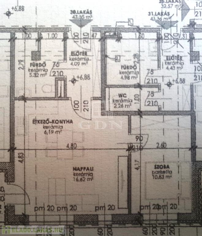 A lakás nettó 43,05 nm, helyiségei:előtér 4,09 nm, fürdőszoba 5,32 nm, étkező/konyha 6,19 nm, nappali/lakószoba 16,62 nm, szoba 10,53 nm, terasz 3,14 nm.