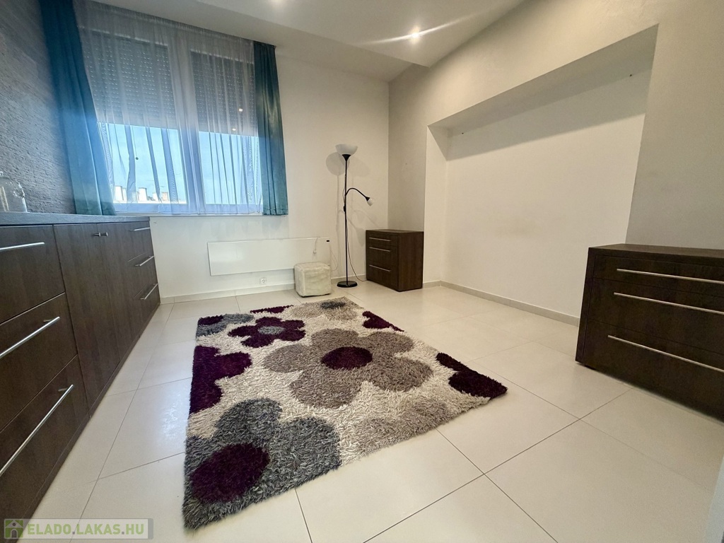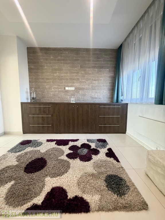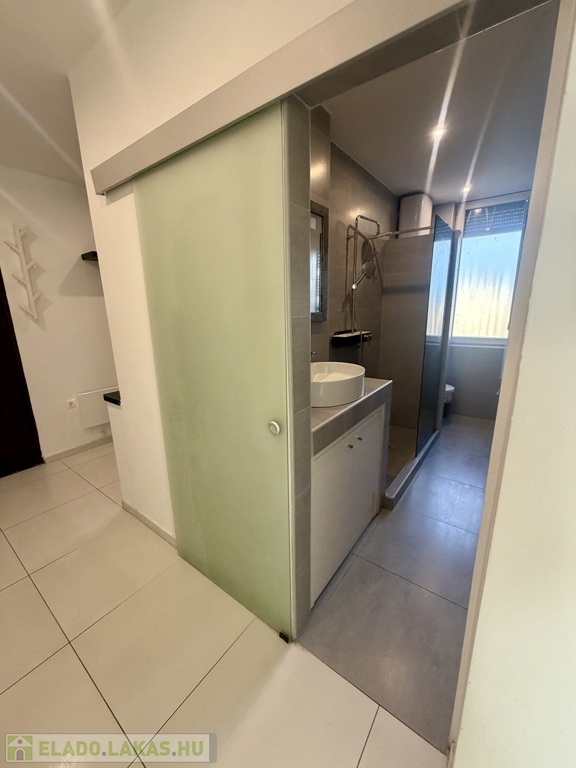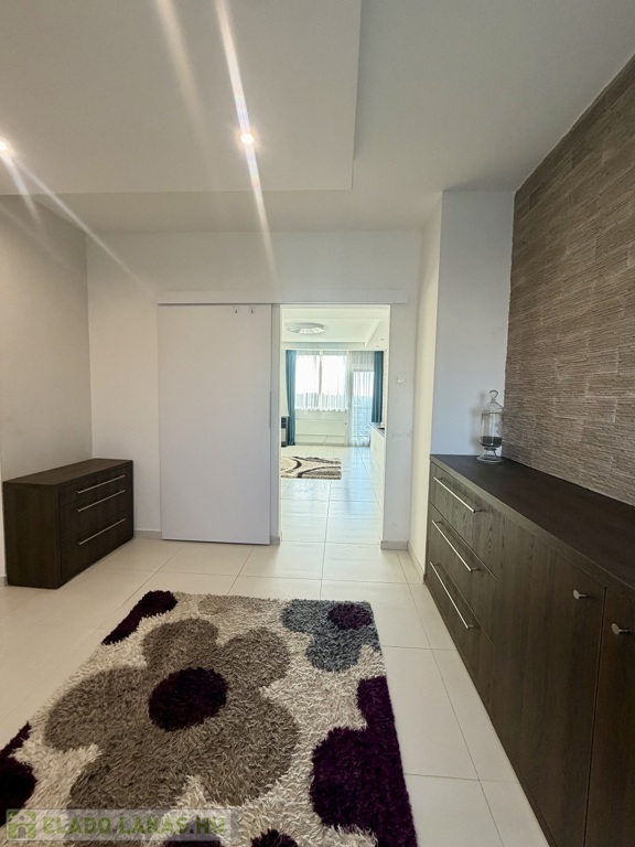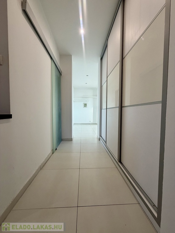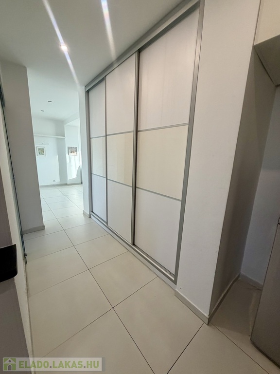 Az előszobában és a hálóban nagy méretű, magasfényű beépített szekrények kínálnak bőséges tárolóhelyet. A burkolatok, beépített bútorok, világításelemek, és az ízléses tolóajtók mind a praktikum, és a letisztultság jegyében készültek.