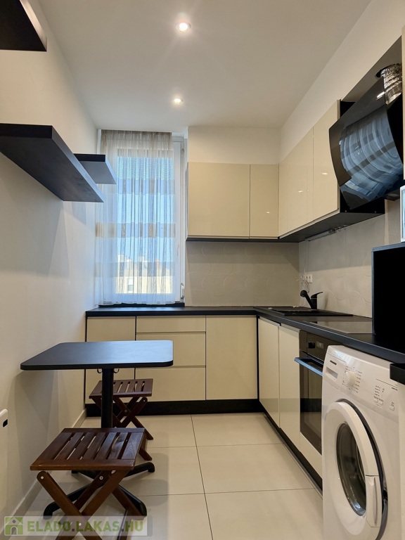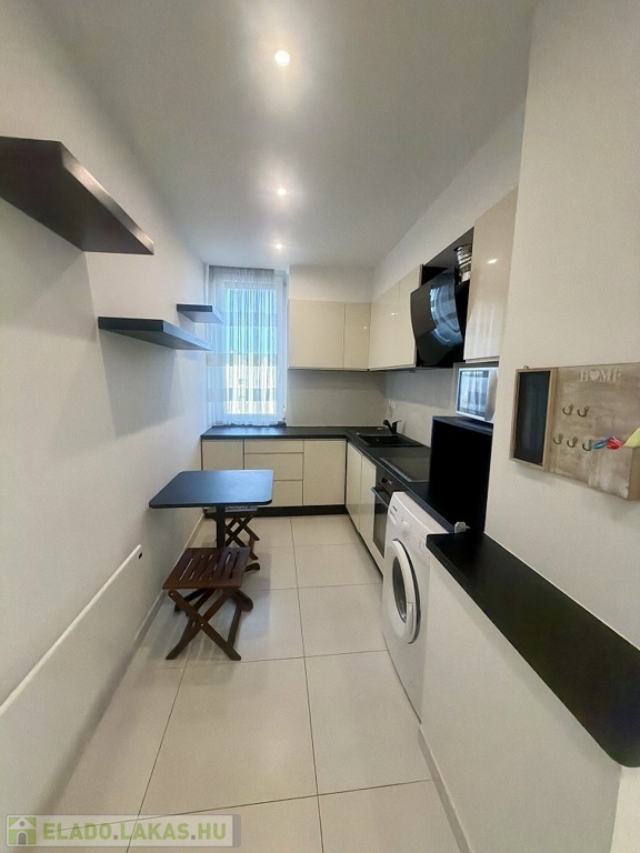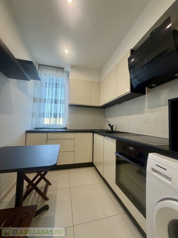 A konyha modern, beépített gépekkel felszerelt: AEG indukciós főzőlap, szagelszívó, Electrolux sütő és mosógép. A lakásban Daikin hűtő-fűtő klíma biztosítja az egész éves komfortot.