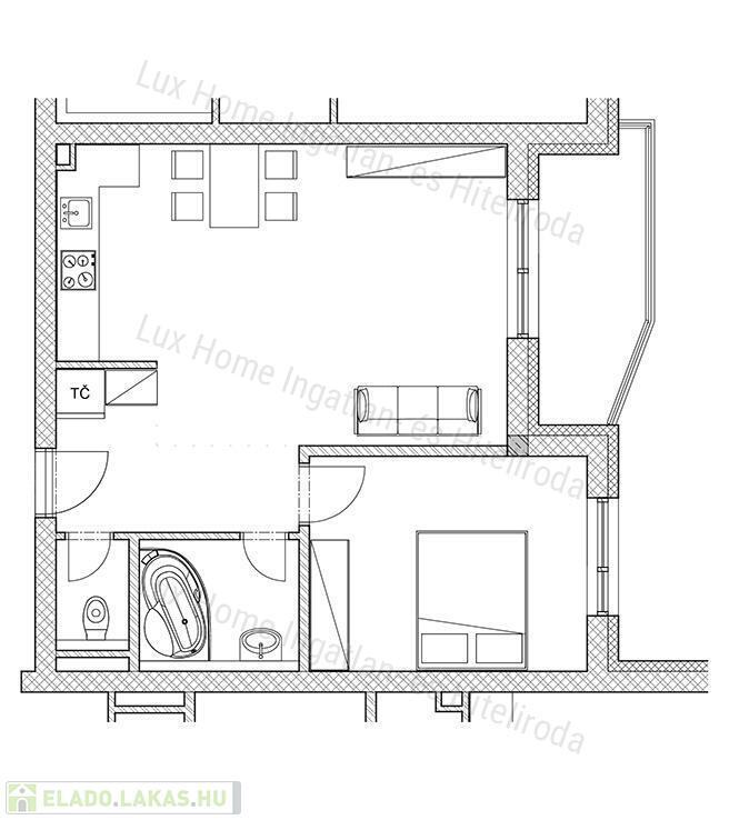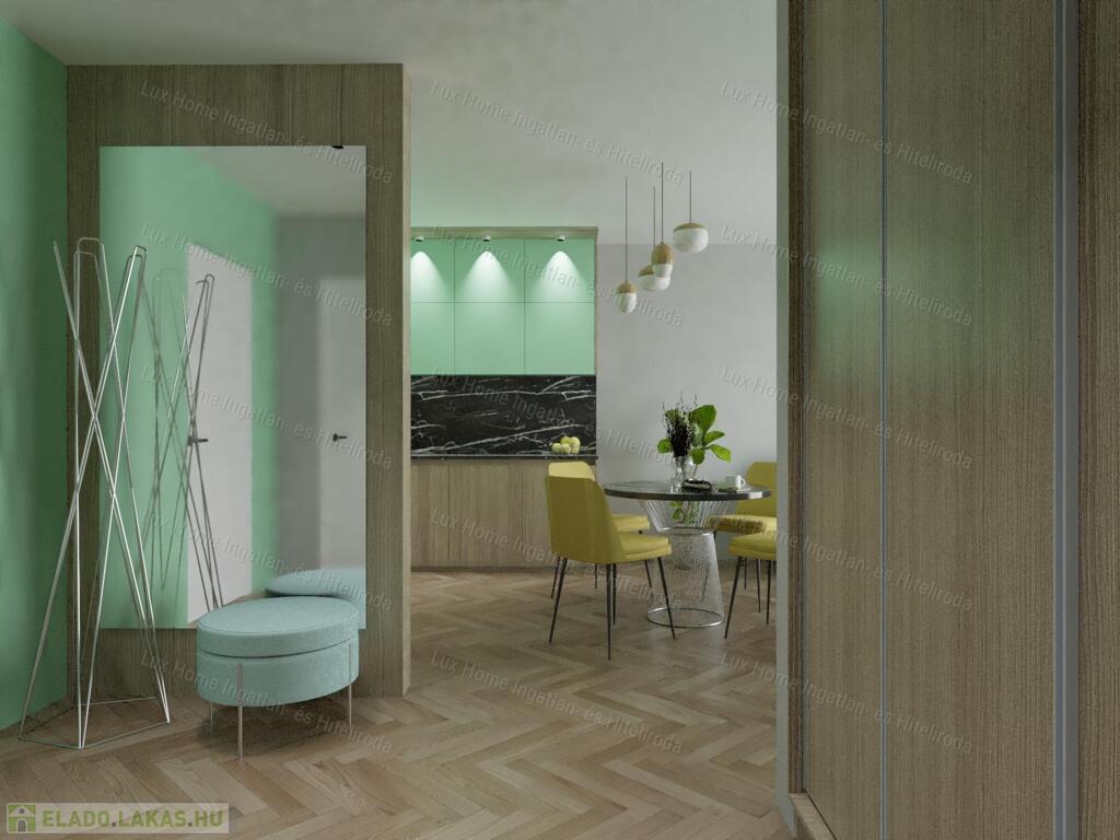 lett tervezve. A szoba laminált padlóval , a többi helyiség járólappal burkolt.
