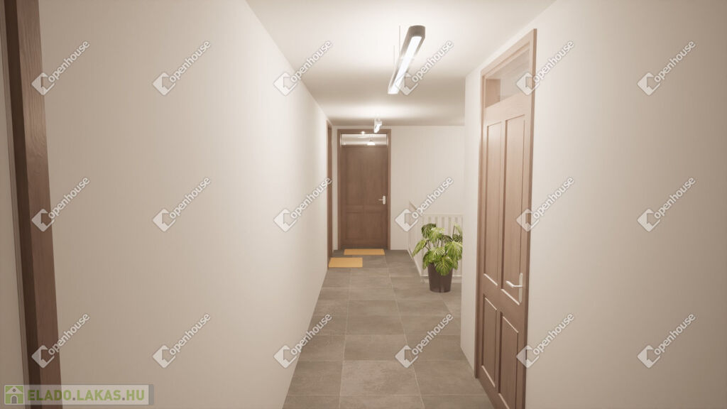 Belső elrendezése: előtér, nappali-konyha-étkező, hálószoba, fürdőszoba, erkély.