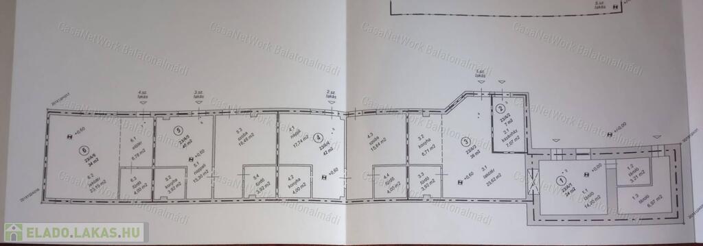 1. lakás 34 m2, 2. lakás 40 m2, 3. lakás 42 m2, 4. lakás 36 m2 kiszolgáló helyiségek: 31 m2