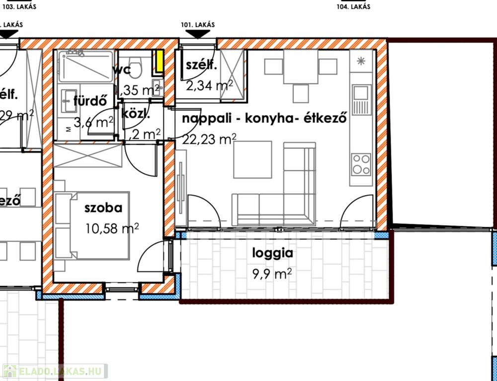 A 1 db amerikai konyhás nappalival, 1db hálószobával, 1 db fürdőszobával, közlekedővel, loggiával rendelkezik.