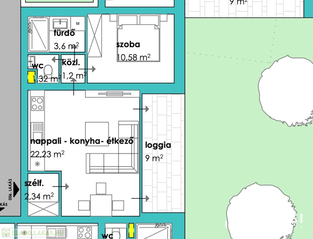 A 1 db amerikai konyhás nappalival, 1db hálószobával, 1 db fürdőszobával, közlekedővel, loggiával rendelkezik.